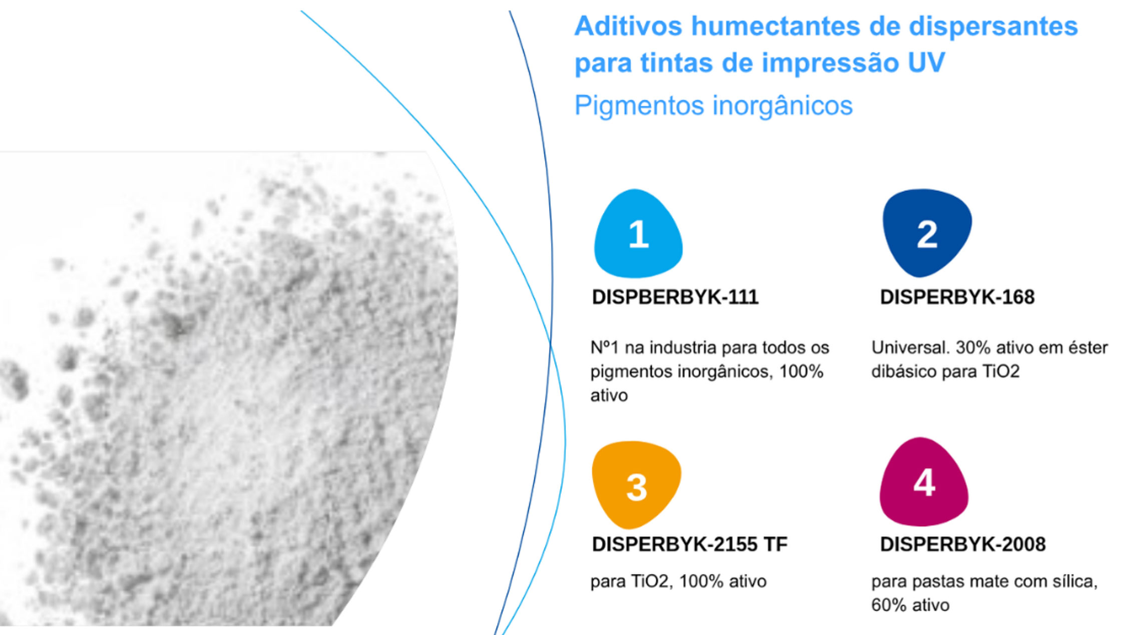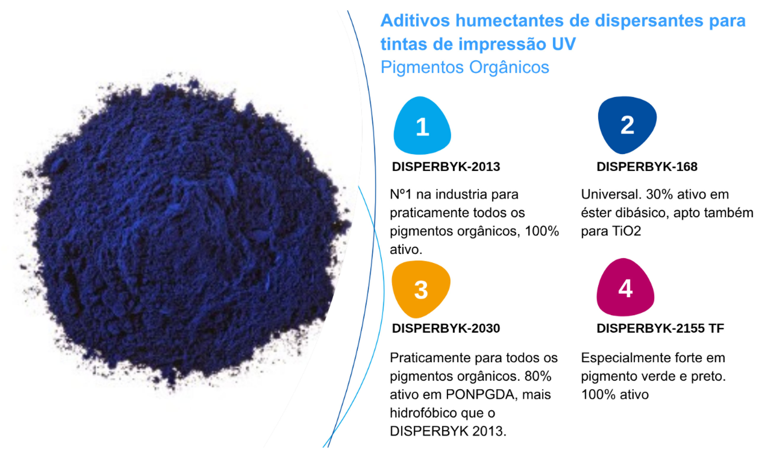 A escolha dos aditivos humectantes e dispersantes dependerá do tipo de pigmento, orgânico ou inorgânico.