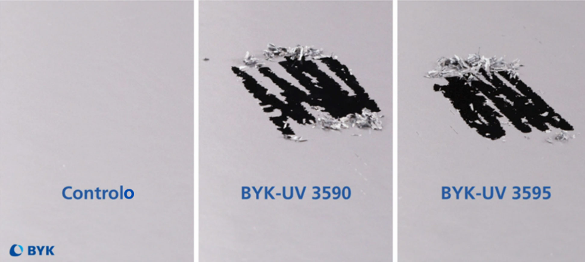 Para melhorar a liberação da fita e obter propriedades de deslizamento extremas, o BYK-UV 3590 e o BYK-UV 3595 podem ser testados em cartolina raspável, como as da imagem.