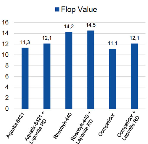Graph: Evaluation of the pigment effect orientation (flop value) in an automotive aqueous base coat with different rheological additives and their combinations.